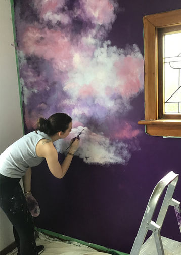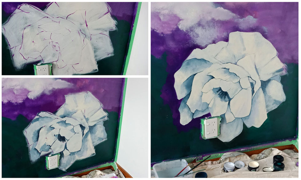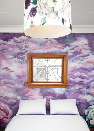 Inspired by a romantic new light shade, the feature wall behind the bed was painted with multiple tones of purple and magenta and the flowers in the corners match the ones on the fabric pattern. The rest of the guest room is kept white and simple to maximize the light and focus the attention on the mural.